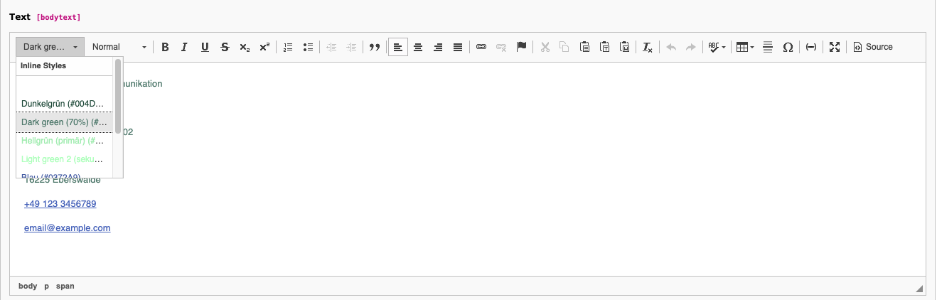 In dem unten gezeigten Beispiel gibt es in dem Element mit der Bezeichnung “Text” im Feld “Styles” / “Stil” Optionen, um den Text einzufärben