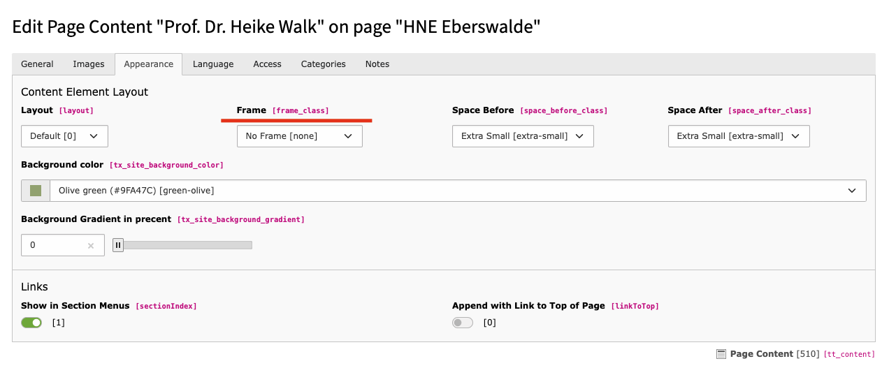 Wählen Sie im Feld “Rahmen” / “Frame” die Option “No Frame” (deaktiviert die Standardtrennung zwischen Elementen)