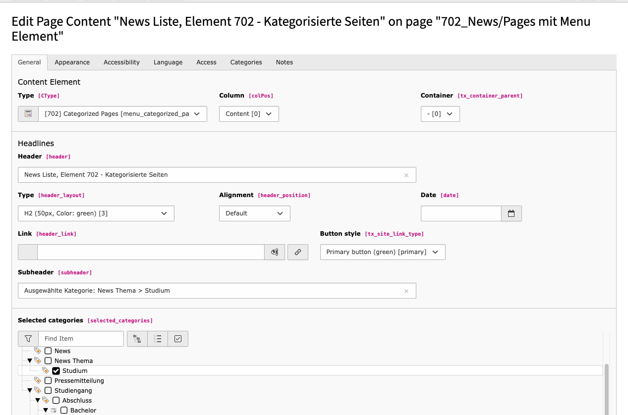 Erstellung eines Elements, das alle “News” oder “Seite” einer Kategorie anzeigt
