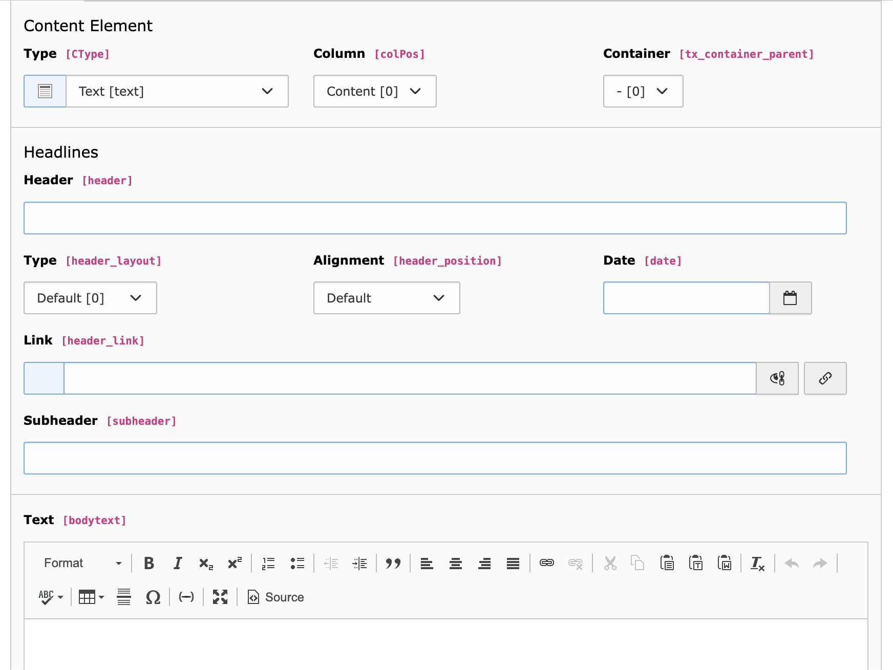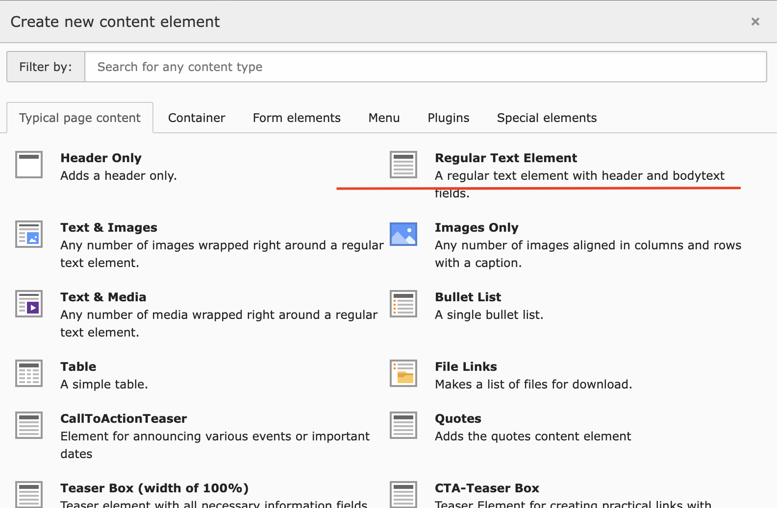 Im Fenster “Create new content element” das folgende Element auswählen: