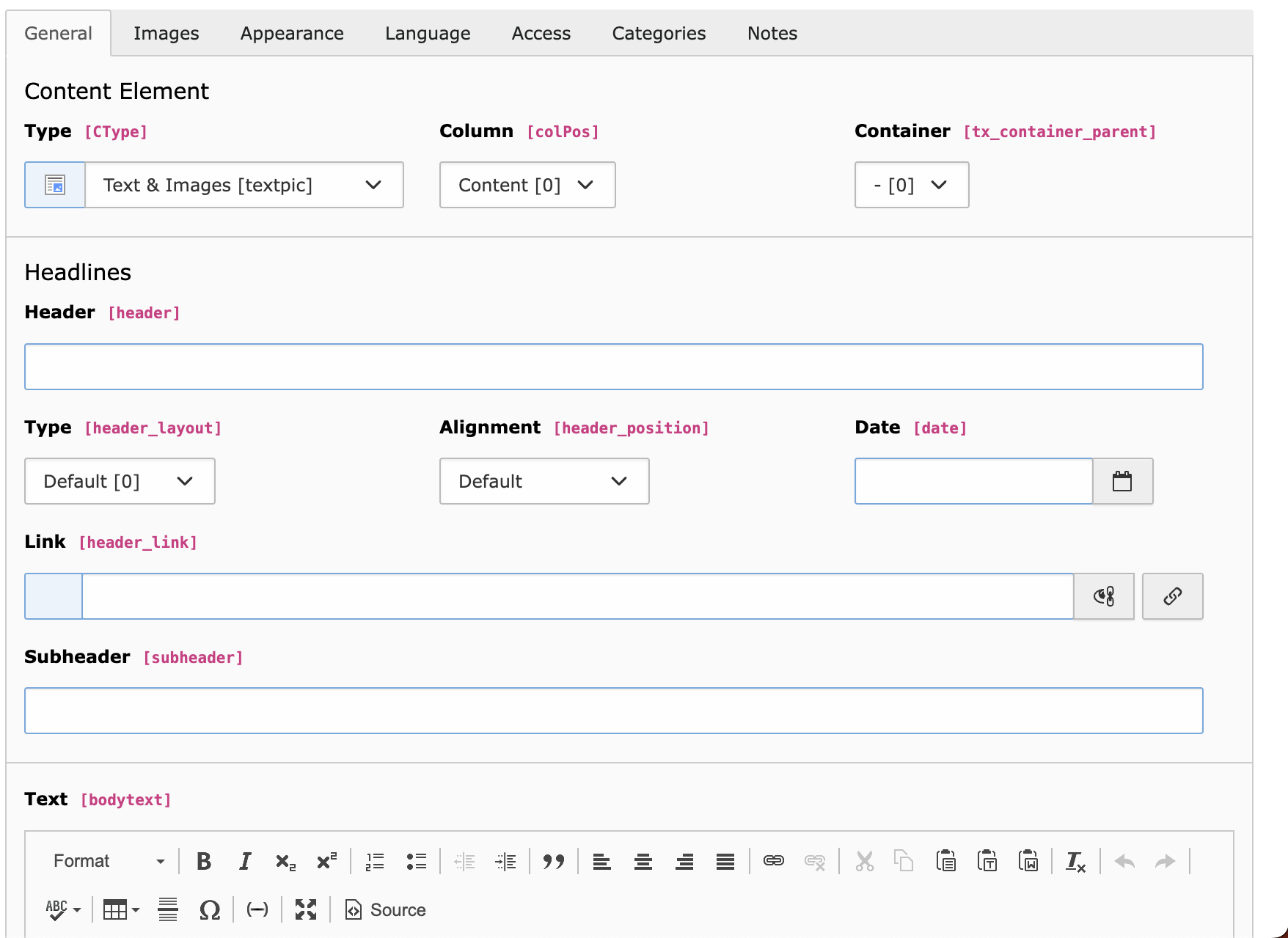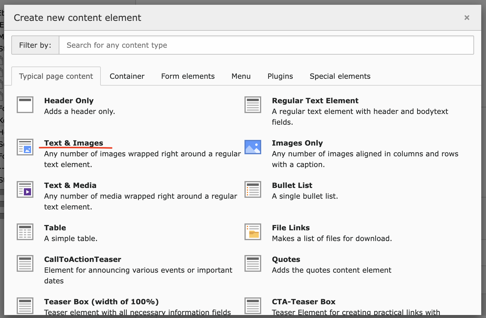 Im Fenster “Create new content element” das folgende Element auswählen: