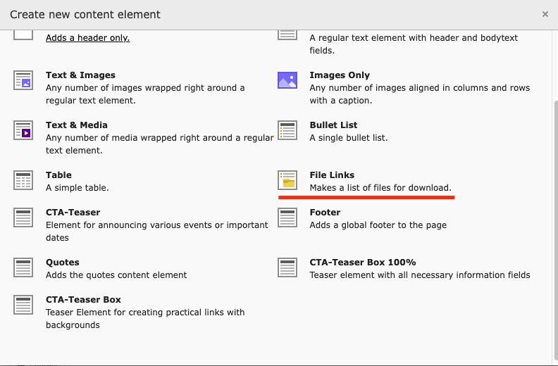 Im Fenster “Create new content element” das folgende Element auswählen: